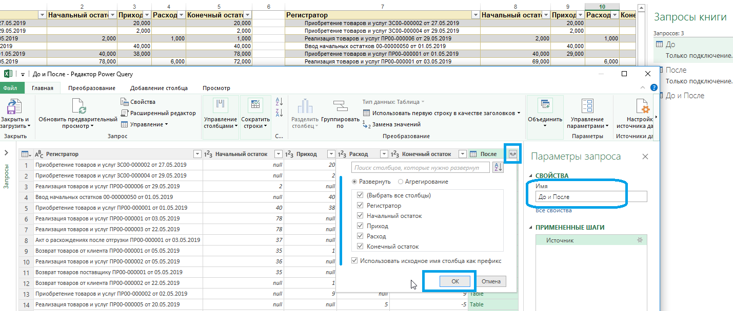 Вы снова попали в «Редактор Power Query». Здесь обе таблицы объединены в одну путем слияния указанных столбцов. В «Свойствах» задайте имя новому документу — раскройте крайнюю правую колонку, нажав на иконку .