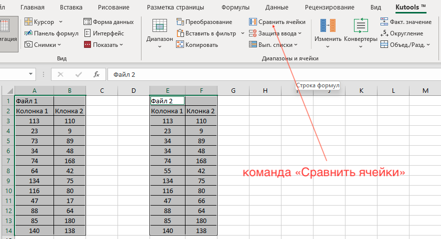 2. Вызываем команду Kutools -Сравнить ячейки, как показано ниже