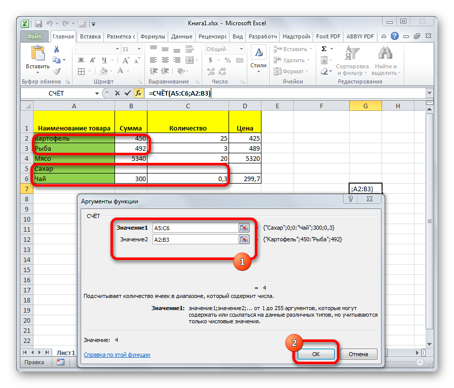 Запускается окно аргументов. Аргументы те же самые, что и при использовании предыдущего способа. В их роли выступают ссылки на ячейки. Вставляем координаты диапазонов на листе, в которых нужно подсчитать количество заполненных ячеек числовыми данными. Жмем кнопку «OK».