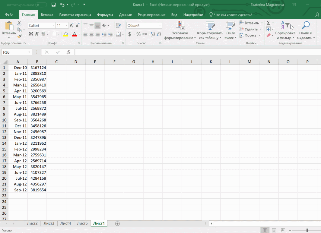 - Откройте таблицу с данными за период и соответствующими ему показателями, например, от года.