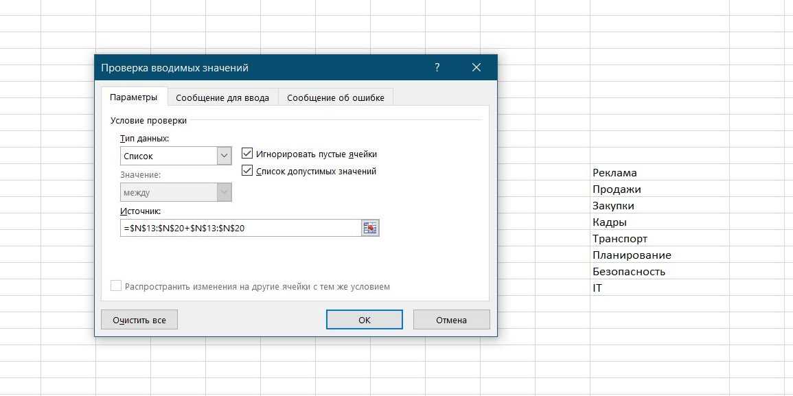 - В поле «Источник» (Source) задайте диапазон, содержащий эталонные варианты элементов, которые и будут впоследствии выпадать при вводе.