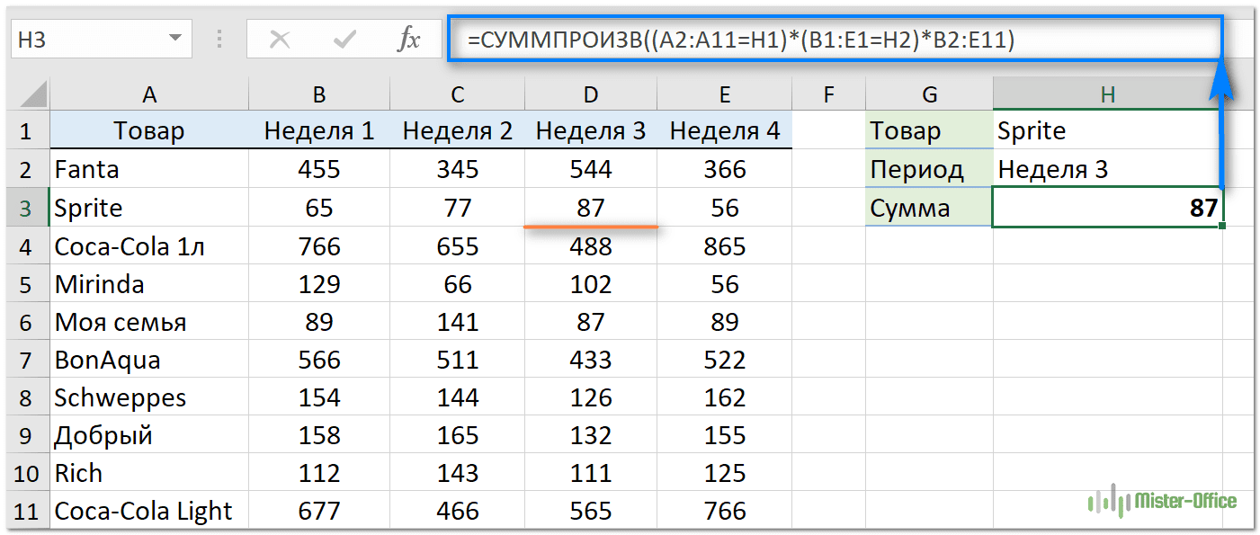 Теперь поясним подробнее. В начале мы сравниваем два значения поиска с заголовками строк и столбцов (целевой товар в H1 со всеми наименованиями в A2: A11 и целевой период времени в H2 со всеми неделями в B1: E1):