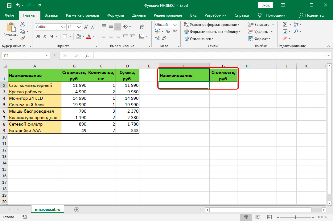 Наша задача – используя ИНДЕКС и ПОИСКПОЗ добавить в ячейку со стоимостью (G2) такую функцию, которая будет выводить конкретное значение в зависимости от того, что будет указано в ячейке с наименованием рядом.
