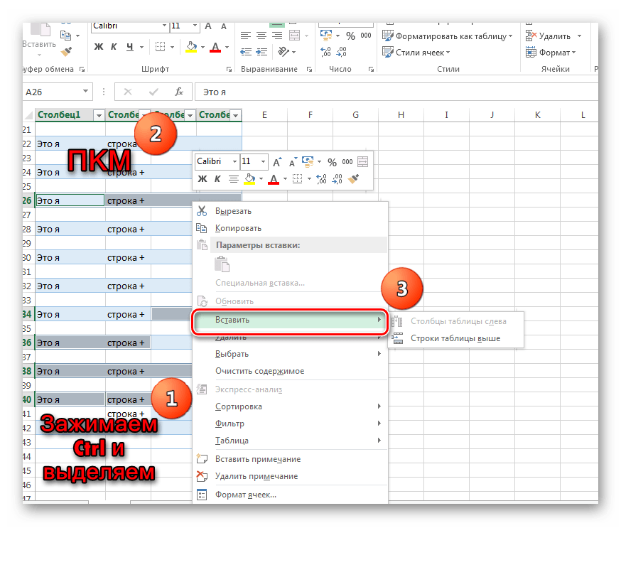 - Нажмите и удерживайте клавишу «CTRL», выделите поочерёдно нужные строки (к примеру, шестая, тридцатая, сотая). Теперь действуйте по методу 5: заходите в меню и выбираете вставку строк. Во время вставки ссылки, как абсолютные, так и относительные, настраиваются в автоматической форме.