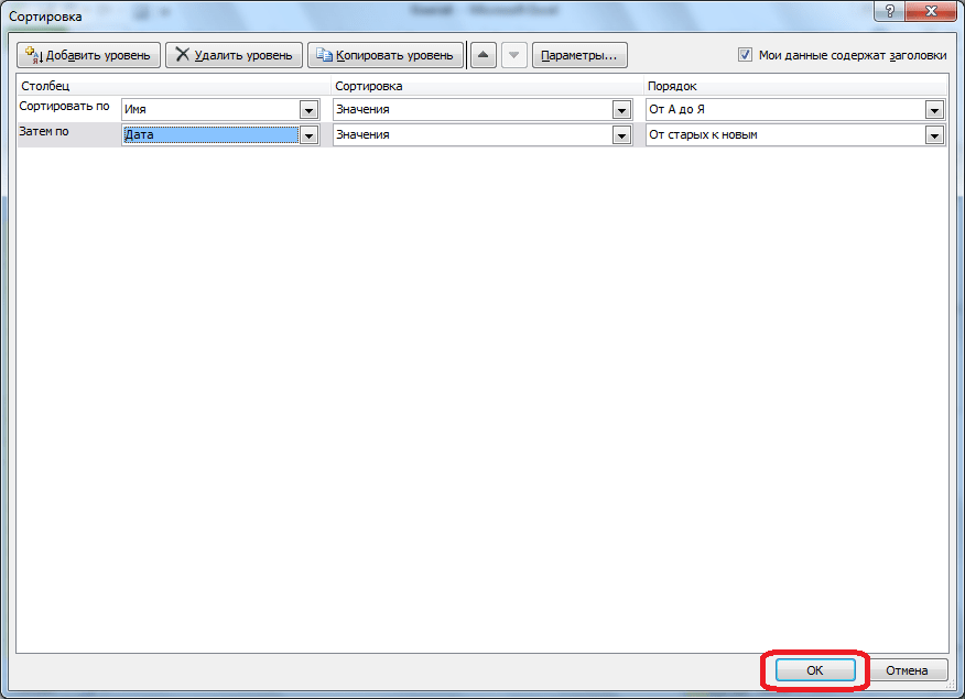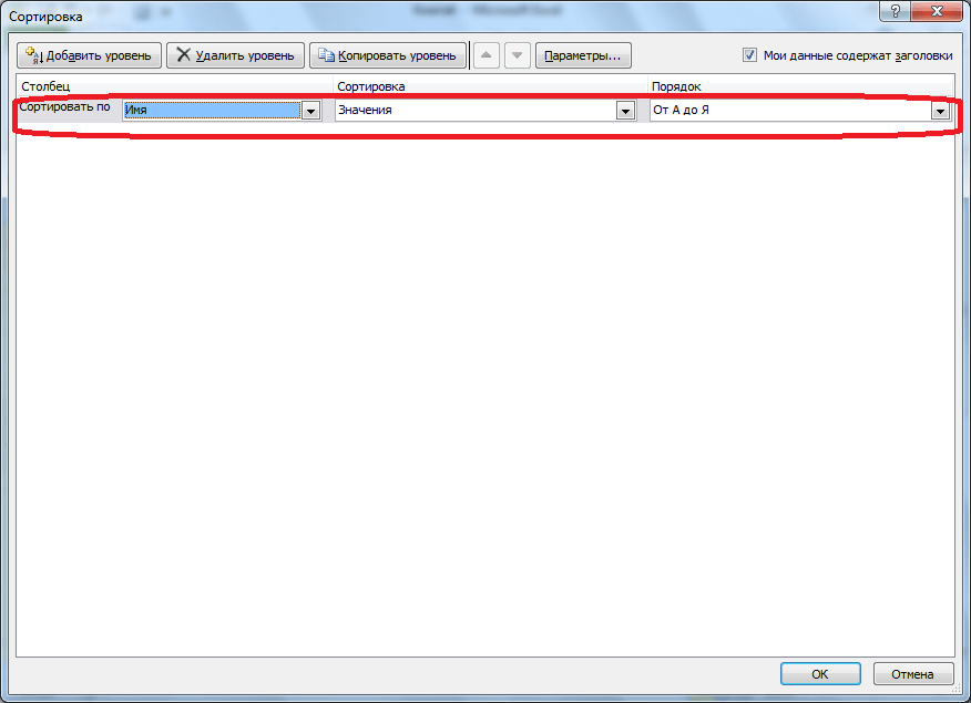 Говоря о том, каким именно образом будет осуществлена подобная сортировка, стоит заметить, что Эксель пойдет по списку сверху. Первый уровень является наиболее приоритетным. Например, нами выбрано «сортировать людей в зависимости от имени от А до Я – выполнено.