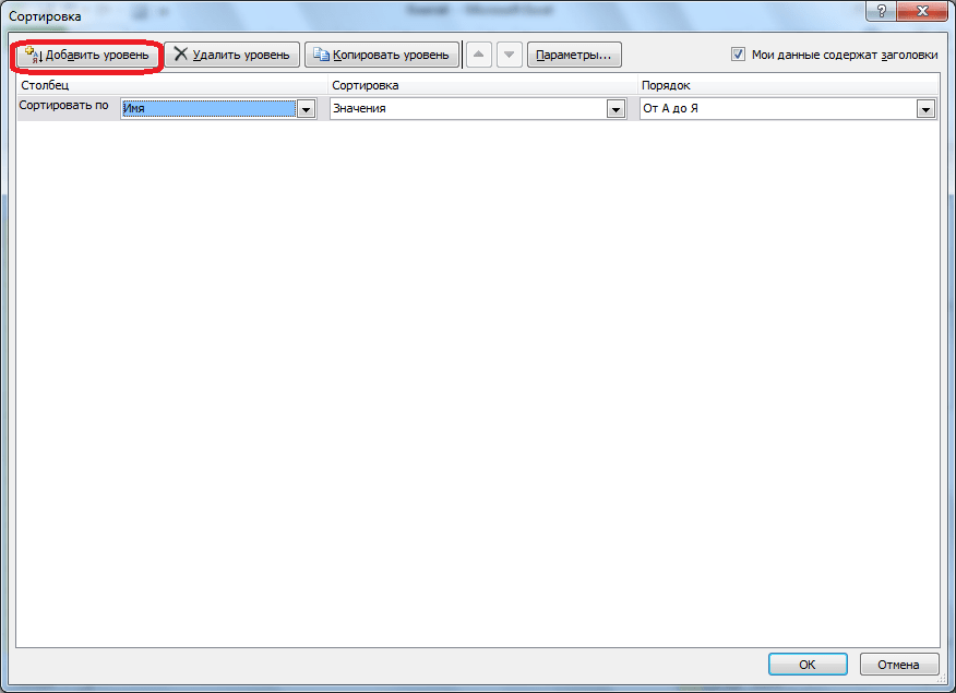 Итак, мы настроили сортировку по одному из столбцов. Для того, чтобы настроить сортировку по другому столбцу, жмем на кнопку «Добавить уровень».
