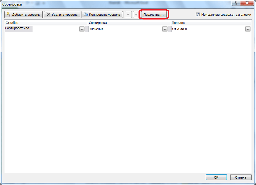 Но, это ещё не все возможности настраиваемой сортировки. При желании, в этом окне можно настроить сортировку не по столбцам, а по строкам. Для этого, кликаем по кнопке «Параметры».