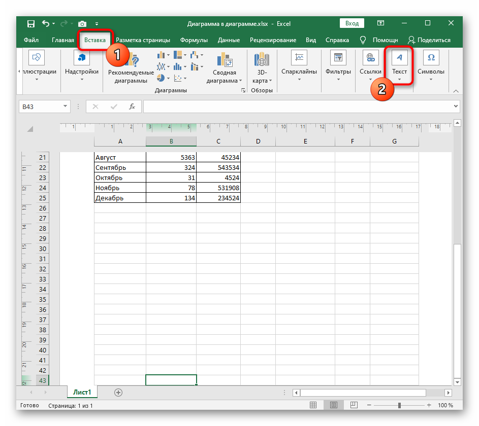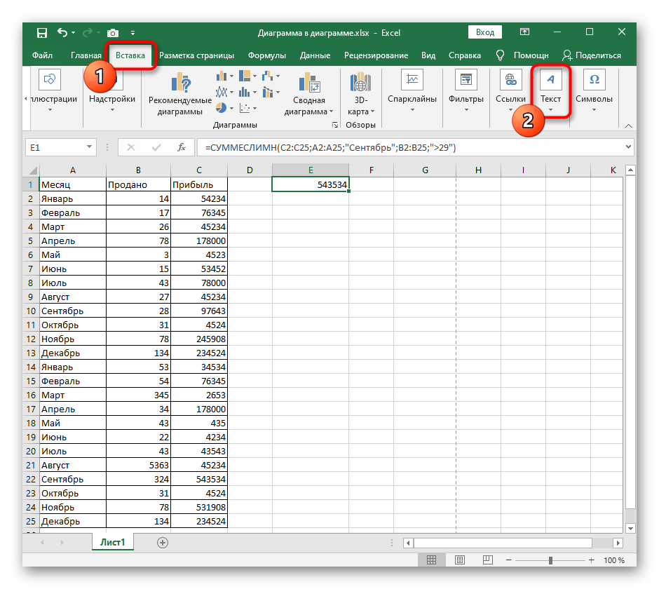 - На рабочем листе откройте вкладку «Вставка» и разверните выпадающее меню «Текст».