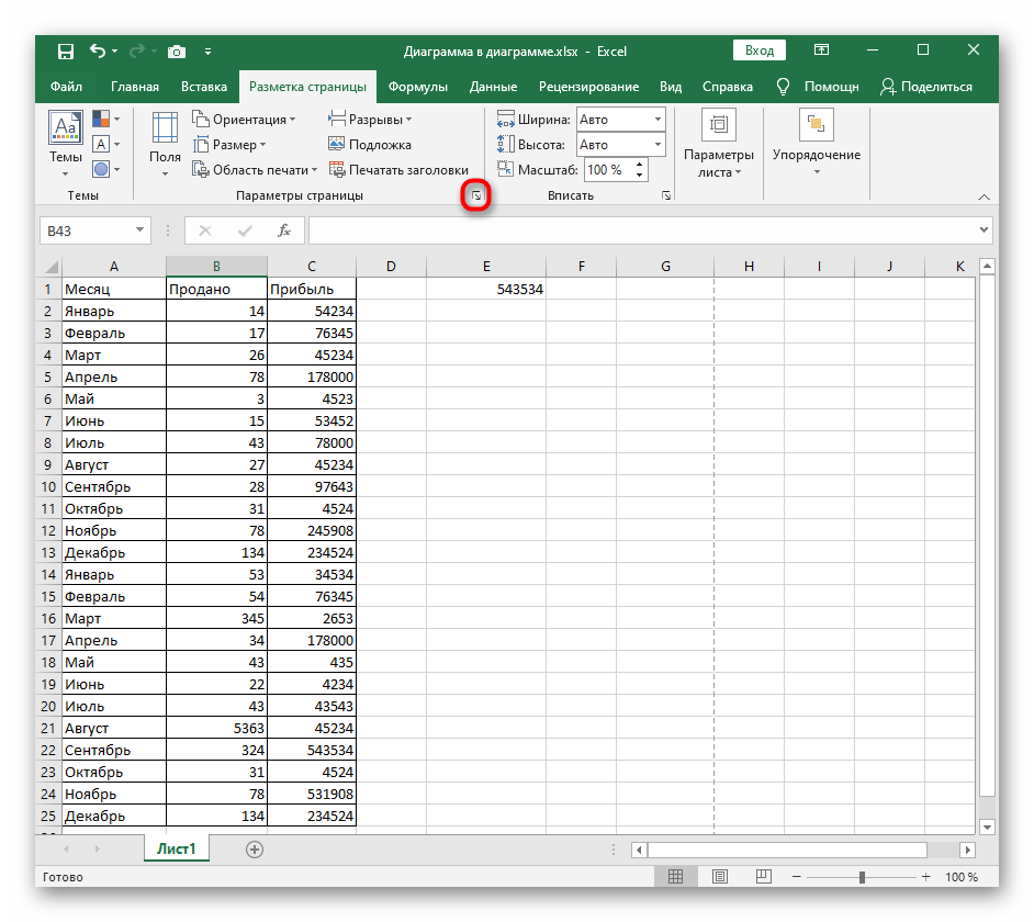 4. В правом нижнем углу блока «Параметры страницы» есть кнопка, изображенная в виде стрелки и уголка.