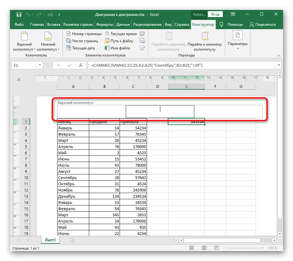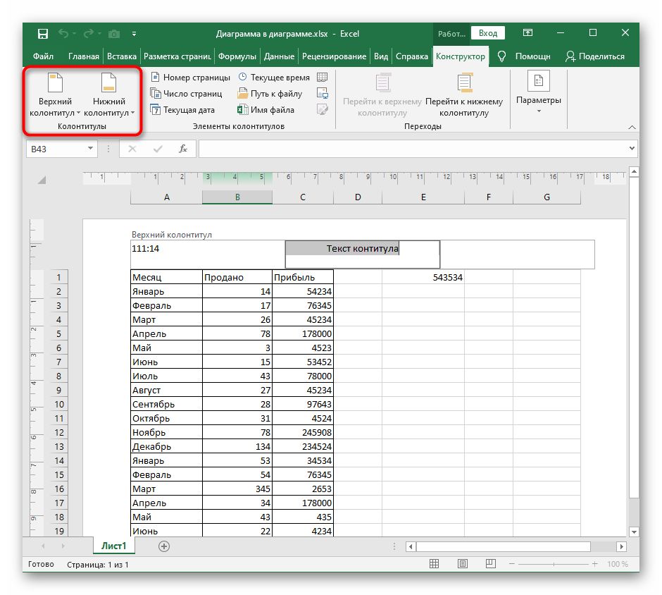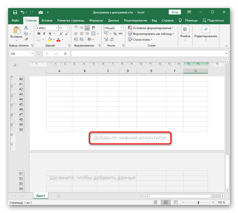 Практически все операции редактирования содержимого таблиц в Excel производятся в обычном представлении, и для вставки колонтитула не всем необходимы расширенные параметры, поэтому добавить эти элементы можно в текущем режиме, выполнив несколько простых действий.