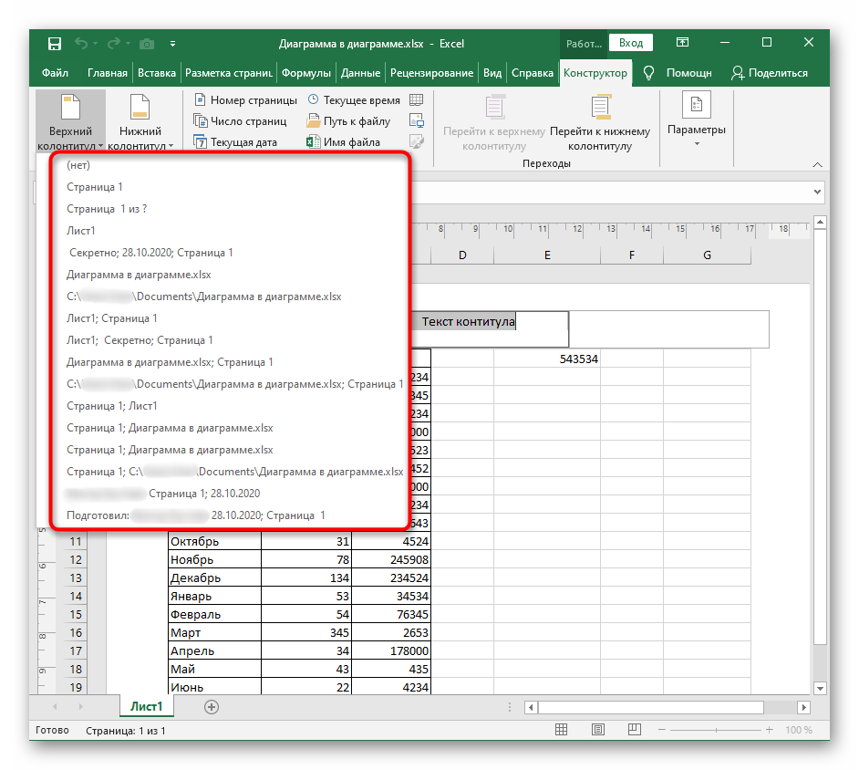Из списка выбирается наиболее подходящий текст, содержащий номер страницы, дату, наименование или путь к файлу. Если ни один из вариантов не подходит, можно произвольно скомбинировать нужные элементы с помощью кнопок на панели «Элементы колонтитулов» в Excel (вкладка «Конструктор»), добавив не только порядковый номер, но и количество страниц, дату и время формирования файла, имя и путь к файлу, наименование листа или рисунок.