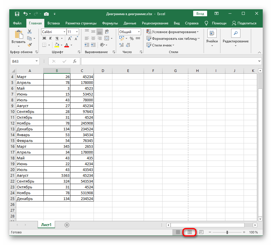 По-умолчанию, эксель иногда разбивает страницу на листы совсем не так как бы нам хотелось. Чтобы взять процесс в свои руки, самый простой способ — перейти в страничный режим разметки.