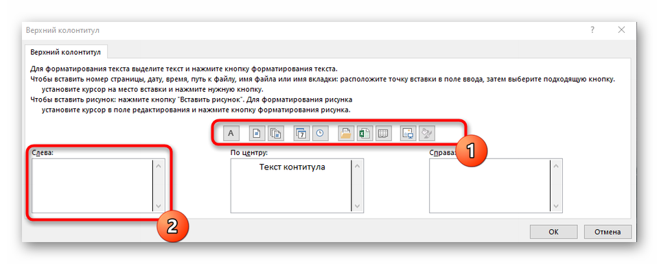 Обратите внимание на присутствующие кнопки: они позволяют добавить номер страницы, дату, время и другие данные в этот блок