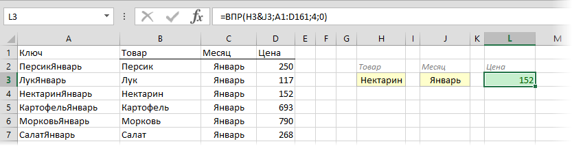 Теперь можно использовать знакомую функцию ВПР (VLOOKUP) для поиска склеенной пары НектаринЯнварь из ячеек H3 и J3 в созданном ключевом столбце: