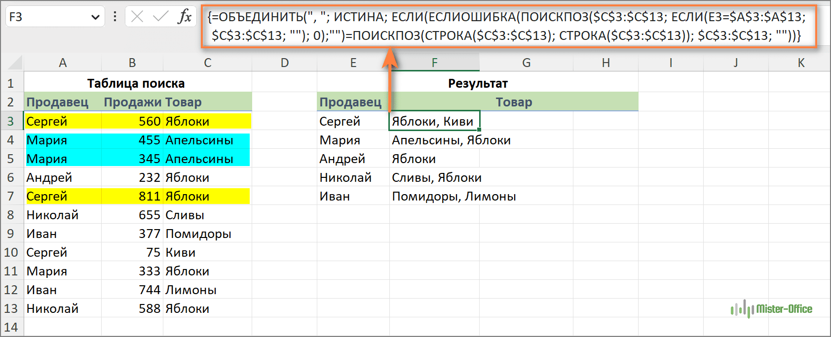 =ОБЪЕДИНИТЬ(«, «; ИСТИНА; ЕСЛИ(ЕСЛИОШИБКА(ПОИСКПОЗ($C$3:$C$13; ЕСЛИ(E3=$A$3:$A$13; $C$3:$C$13; «»); 0);»»)=ПОИСКПОЗ(СТРОКА($C$3:$C$13); СТРОКА($C$3:$C$13)); $C$3:$C$13; «»))