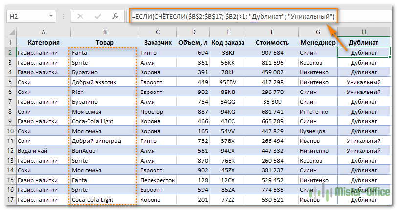 Как видите, когда значение встречается впервые (к примеру, в B4), оно рассматривается как вполне обычное. А вот второе его появление (в B7) уже считается повтором.
