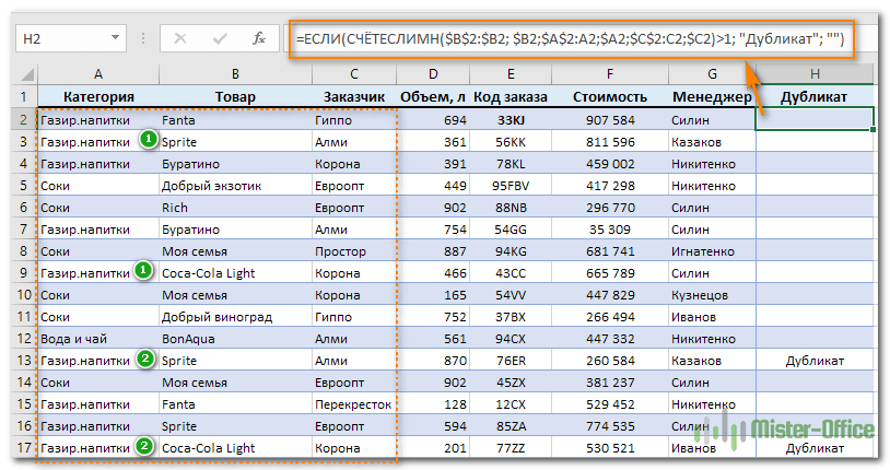 Выделяем строки с одинаковыми наименованиями товаров (столбец B)