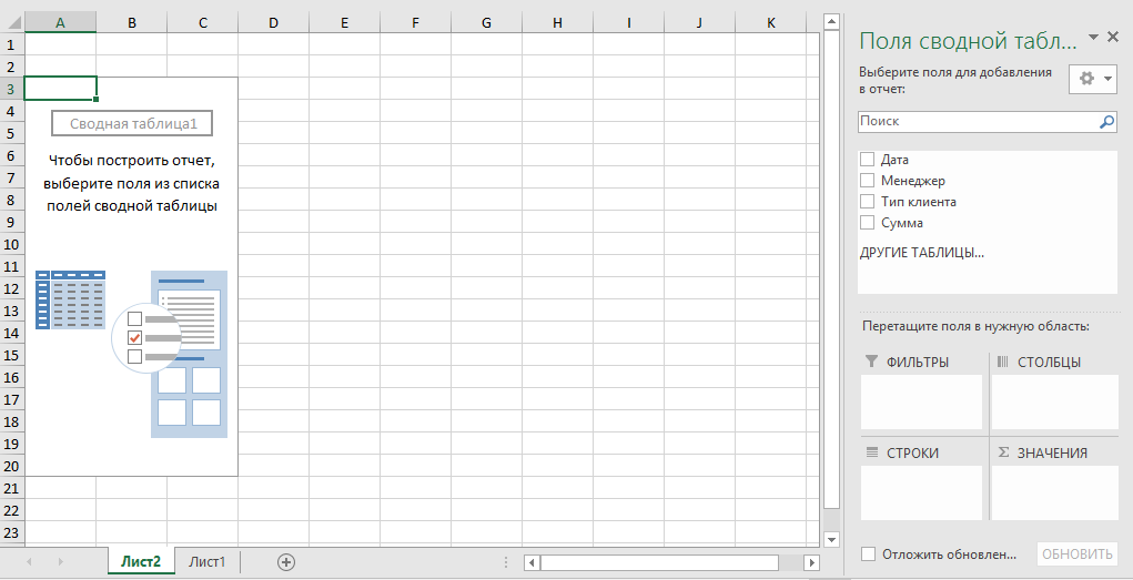 На отдельном листе появится заготовка Сводной таблицы и Список полей, размещенный справа от листа (отображается только когда активная ячейка находится в диапазоне ячеек Сводной таблицы).