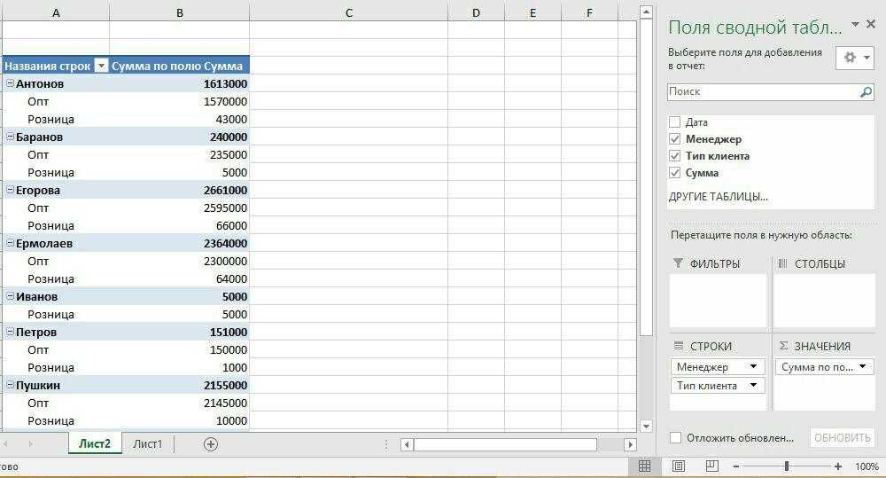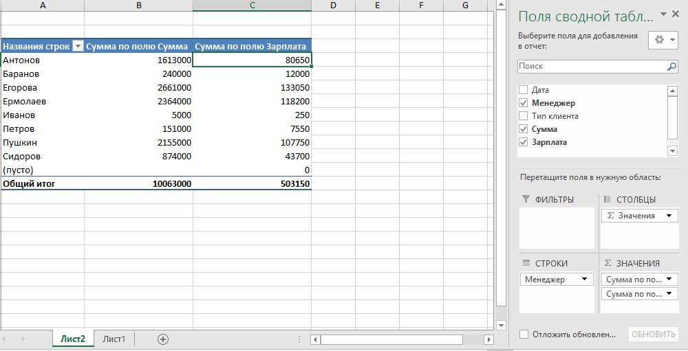Осталось показать, как работать со сводными таблицами в Excel. Снимая и устанавливая галочки в списке полей, меняем вид отчета. Выведем сумму сделок каждого менеджера.