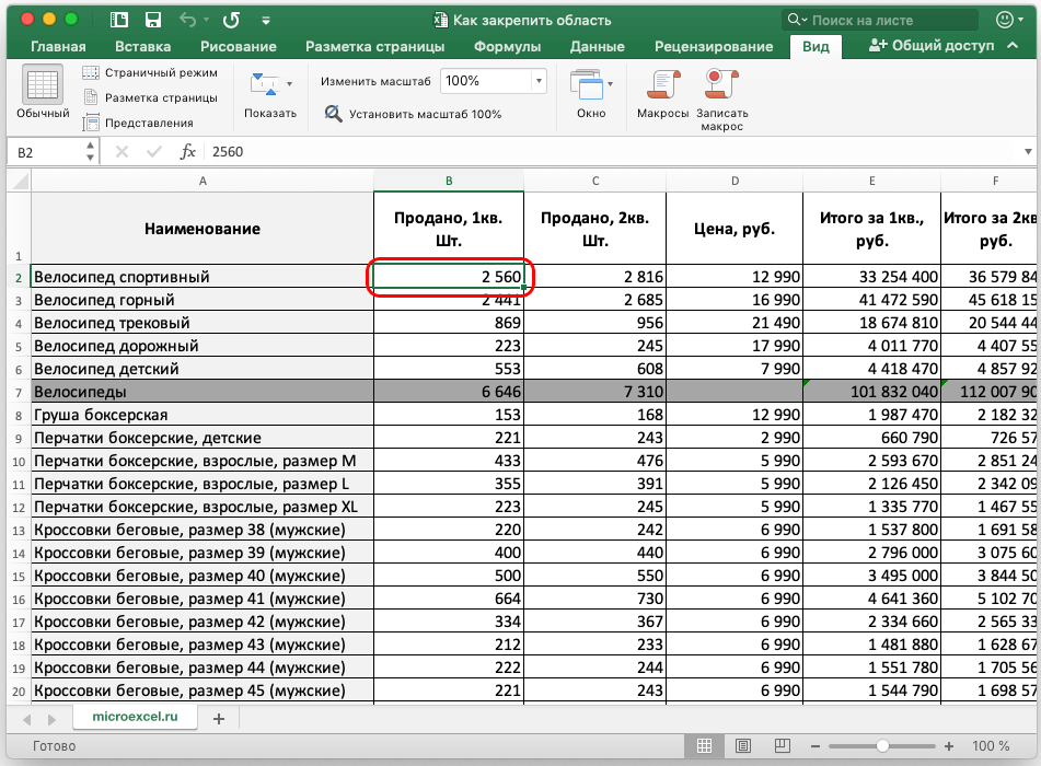 Чтобы закрепить несколько строк и/или столбцов, перейдите на вкладку Вид