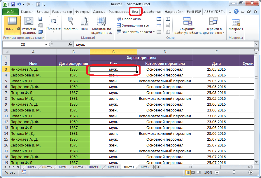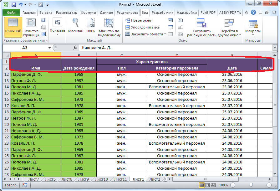 Возьмем следующий пример, в котором подписаны названия для всех столбцов. Переходим на вкладку «Вид»