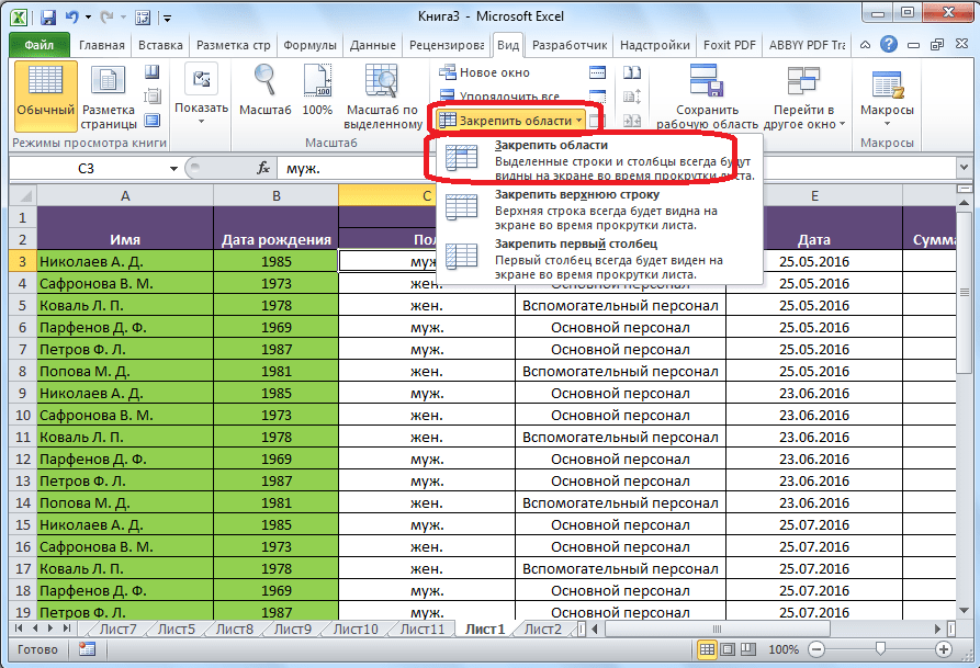 Пользователь также может закрепить все ячейки, находящиеся выше выделенной строчки. Для этого ему потребуется выделить нужную ячейку в середине таблицы, а затем аналогичным образом перейти во вкладку «Вид», где кликнуть по кнопке «Закрепить области». Данный метод закрепления наиболее актуален, когда человеку нужно зафиксировать шапку табличного массива на каждом рабочем листе.