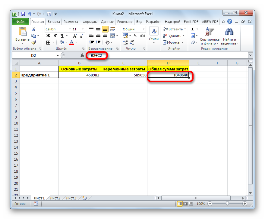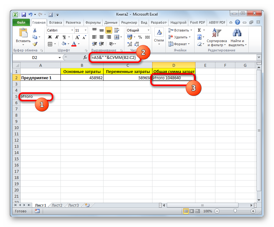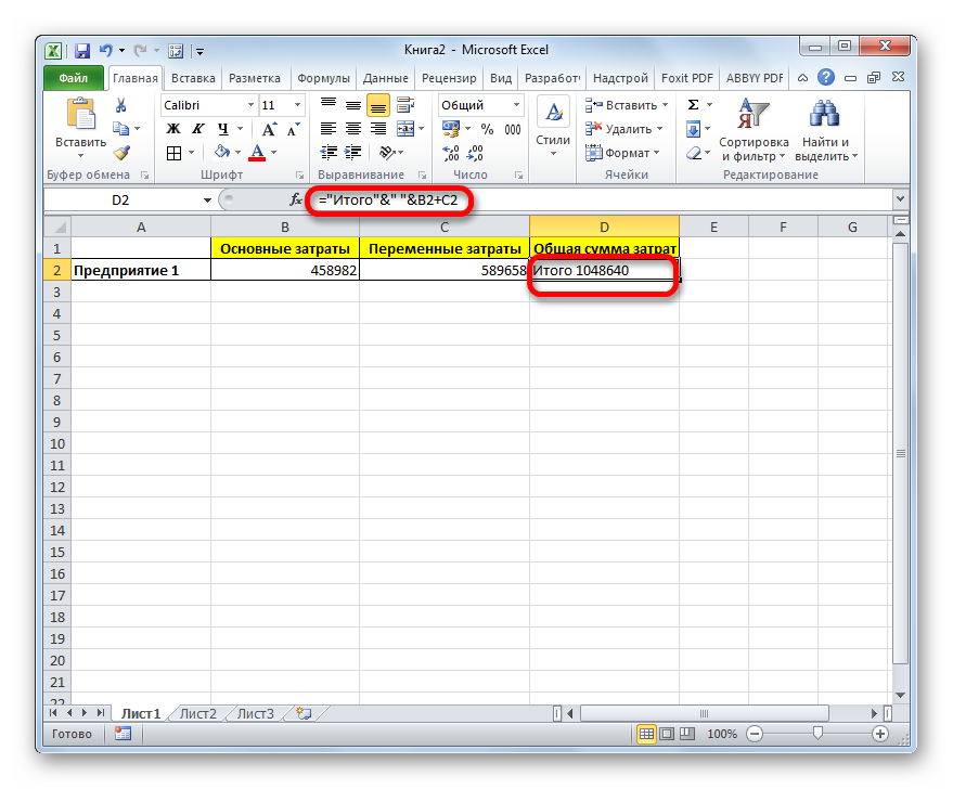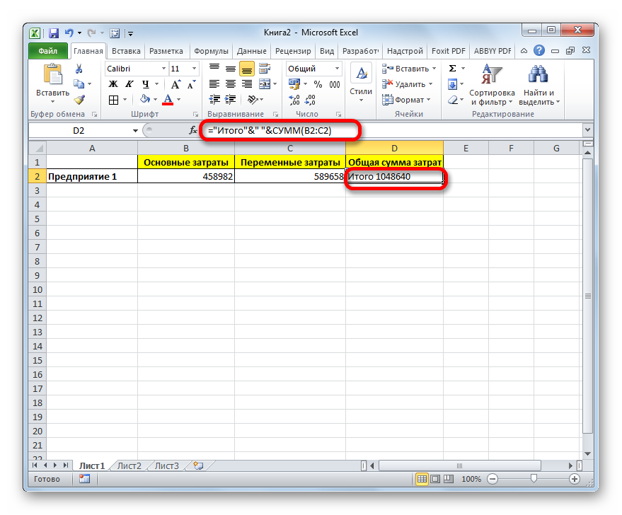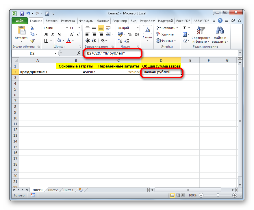 У нас имеется небольшая таблица, в которой в двух столбцах указаны постоянные и переменные затраты предприятия. В третьем столбце находится простая формула сложения, которая суммирует их и выводит общим итогом. Нам требуется в ту же ячейку, где отображается общая сумма затрат добавить после формулы поясняющее слово «рублей».