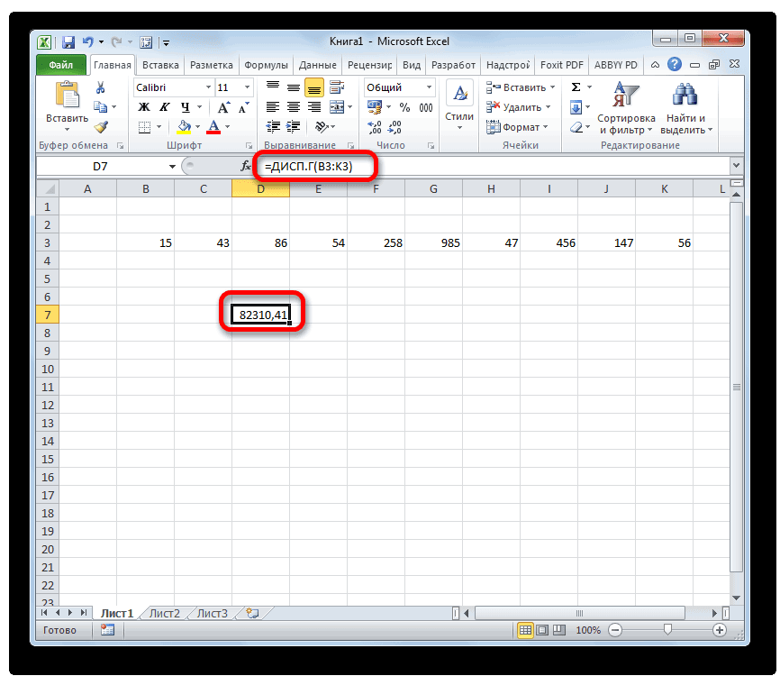 | Дисперсия | =ДИСП.В(A1:A10) |