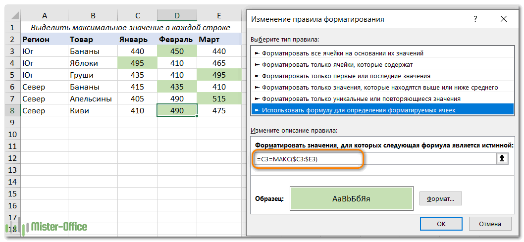 Кончик. Таким же образом вы можете выделить максимальноезначение в каждом столбце. Шаги в точности такие же, за исключением того, что вы пишете условие для диапазона первого столбца и фиксируете координаты строки: