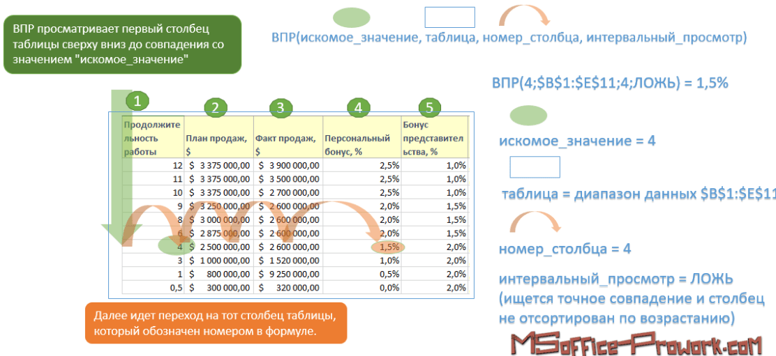 | ВПР | Просматривает левый столбец массива в поисках определенного значения и возвращает значение из указанной ячейки. |