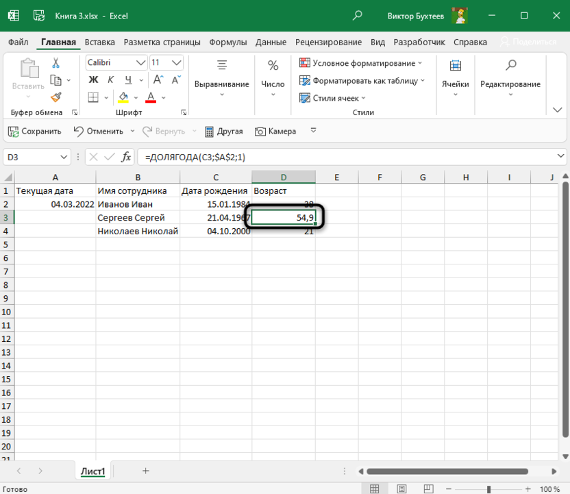 В завершение отмечу, что при удалении всех знаков после запятой возраст будет округляться, если до дня рождения осталось меньше полугода. Если вы хотите избежать этого, оставьте один знак после запятой. Тогда вид значения будет таким, как это показано на следующем изображении.