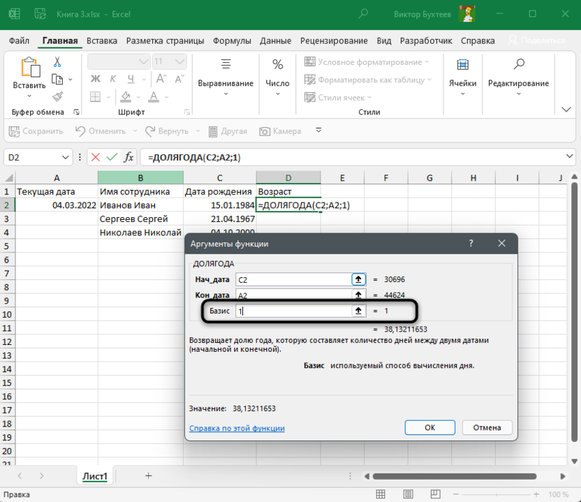 Выберите первую ячейку в столбце «Возраст» и вызовите функцию =ДОЛЯГОДА(.