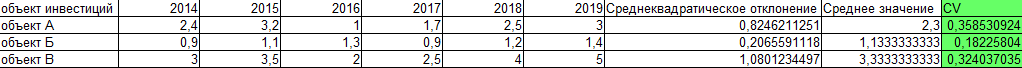 Очевидно, что из всех представленных объектов инвестиций предпочтительным будет объект Б имеющий наименьшее значение коэффициента CV.