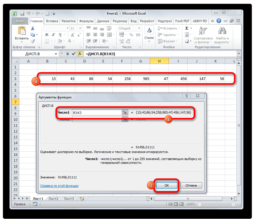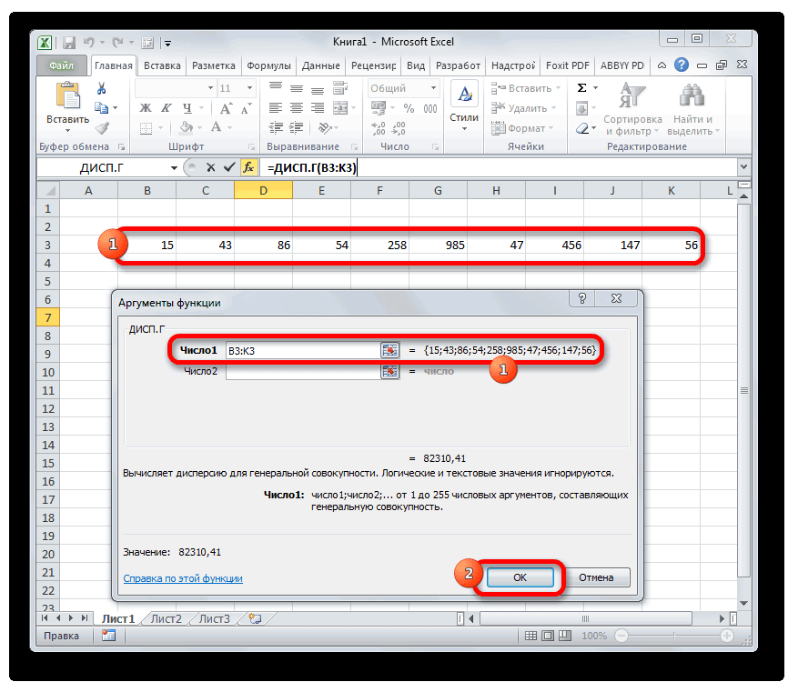 Возможно применить максимум 255 аргументов, не более. Аргументами могут быть простые числа или ссылки на ячейки, в которых они указаны. Давайте рассмотрим, как посчитать дисперсию в Microsoft Excel: