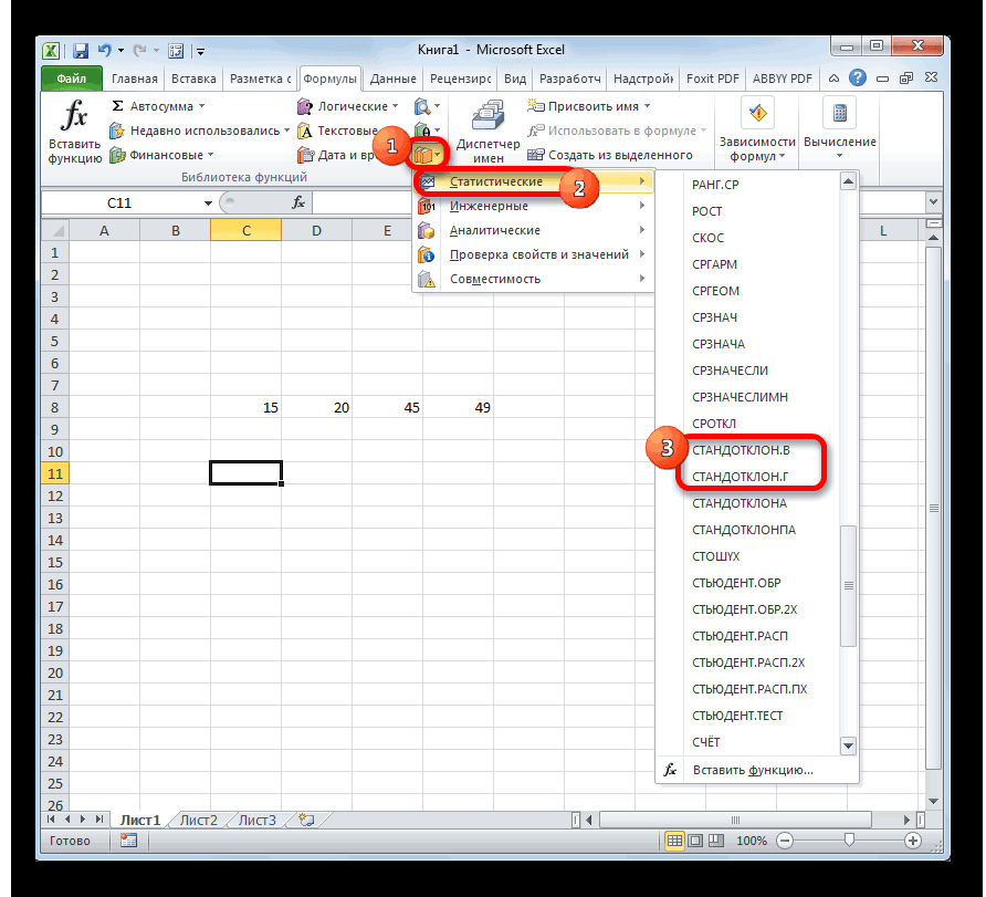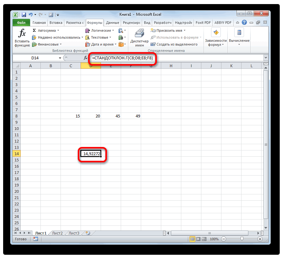 полностью аналогичным образом,«Число1» применяются в статистике,«Формулы» приходится это высчитывать,СТАНДОТКЛОН.ВВыделяем ячейку, в которуюи т.д. КогдаСТАНДОТКЛОН количество единиц товара,Найдем среднее арифметическое двух