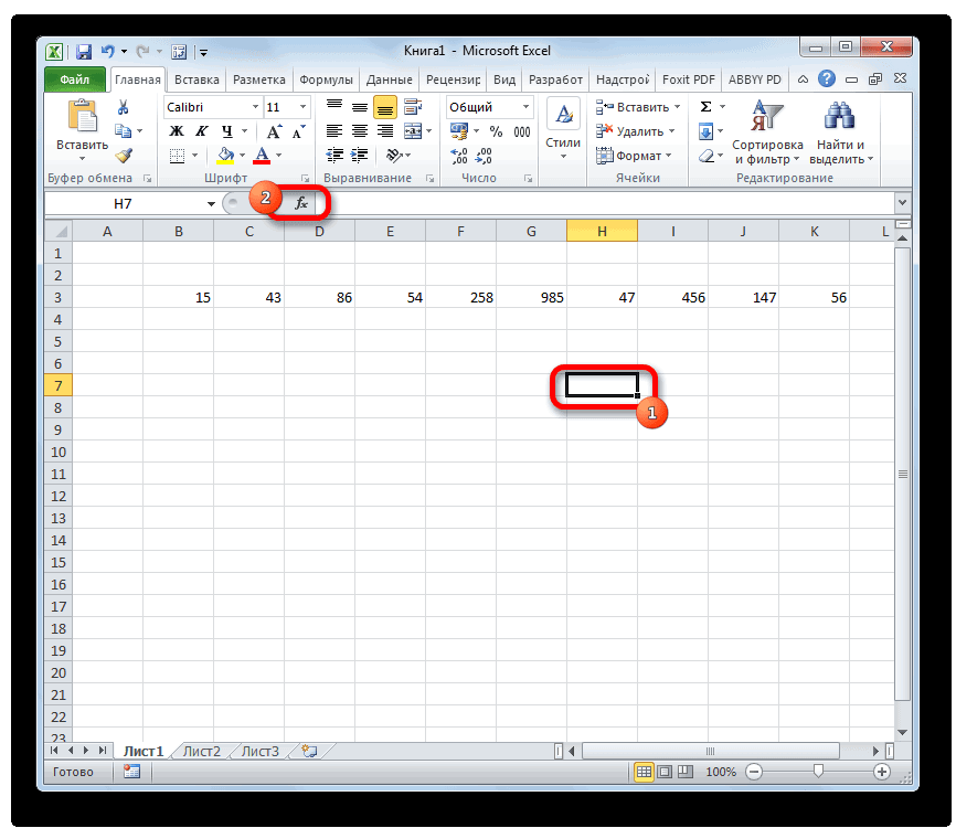 1. Первым делом следует выделить ячейку, где будет отображаться итог вычислений, а далее кликнуть по кнопке «Вставить функцию».