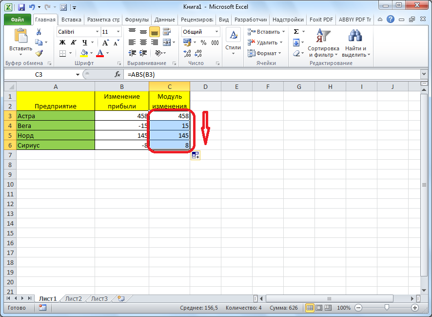Можно распространить действие формулы на другие ячейки. Для этого в ячейке с примененной функцией ABS нажать на правый нижний угол мышкой и не отпуская кнопку «потянуть» мышку вниз, выделяя нужные элементы. К ним будет применена функция.