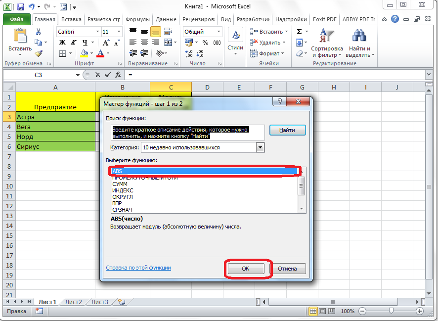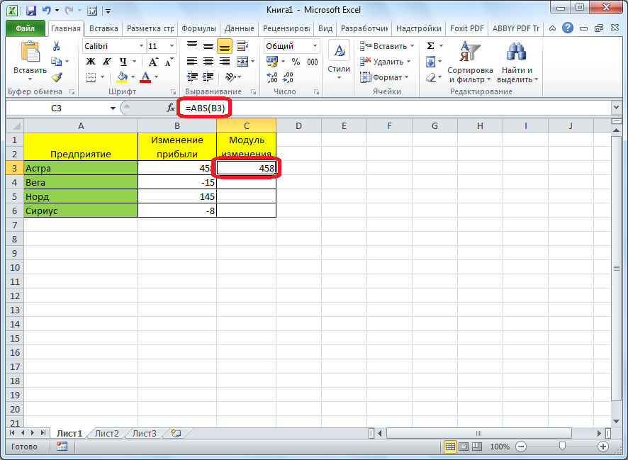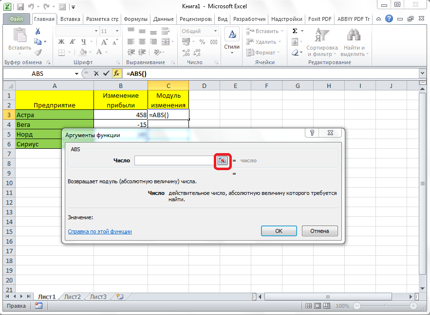 Поставить модуль числа в Excel можно функцией ABS, аббревиатура образовалась от английского слова Absolute, что означает «абсолютный».