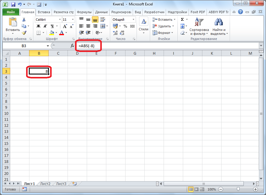 Вписать в ячейку или в строку формул значение, для которого нужно найти модуль. Пусть это будет -8. Тогда надпись будет такова: «=ABS(-8)».