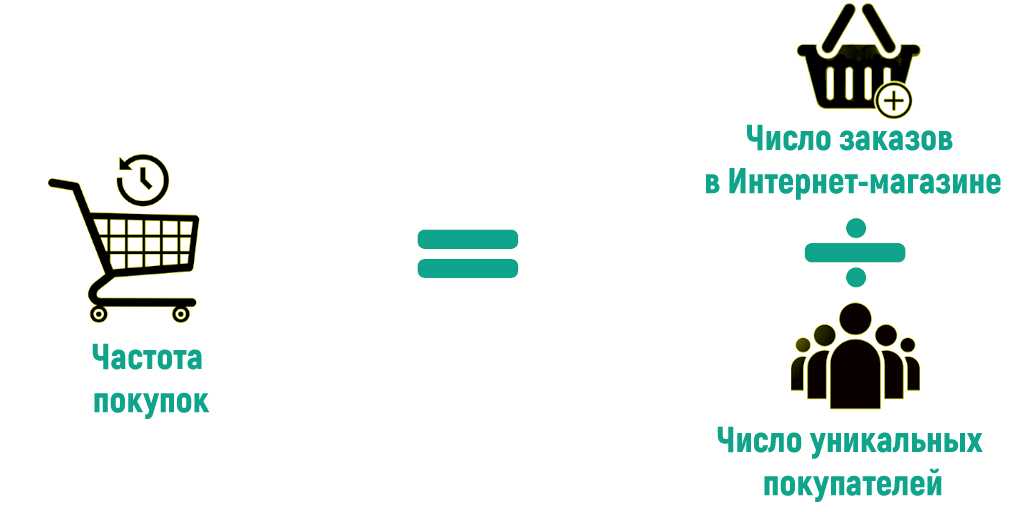 Как считаем: нужно разделить общее количество покупок за период времени на количество уникальных клиентов, совершивших покупки в течение этого периода времени. Например, общее количество покупок за месяц — 200, а клиентов пришло 50. Итого средняя частота покупок равна 4.