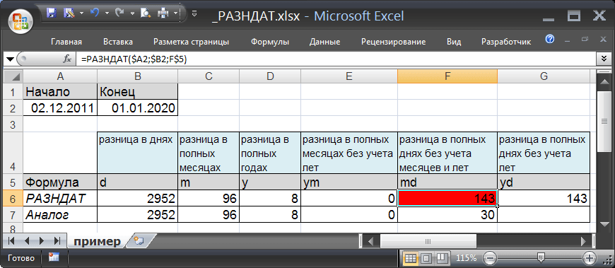 Функция РАЗНДАТ – разность двух дат в днях, месяцах и годах