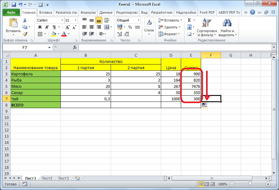 - Чтобы не вводить эту формулу каждый раз для вычисления общей стоимости каждого наименования товара, наведите курсор на правый нижний угол ячейки с результатом и потяните вниз на всю область строк, в которых расположено наименование товара.