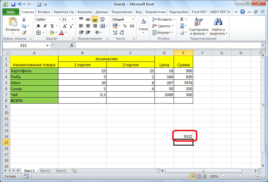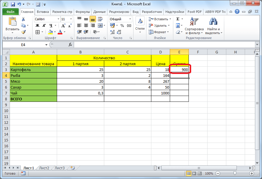 Усложним задачу, разделив количество товара в таблице на две партии. Теперь, чтобы узнать общую стоимость, следует сперва сложить количество обеих партий товара и полученный результат умножить на цену. В арифметике подобные расчеты выполнятся с использованием скобок, иначе первым действием будет выполнено умножение, что приведет к неправильному подсчету. Воспользуемся ими и для решения поставленной задачи в Excel.