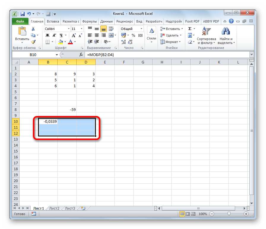 В отличие от транспонированной матрицы, вычислить обратную матрицу технически несколько сложнее. Посчитать обратную матрицу можно через построение матриц алгебраических дополнений и определителя исходной матрицы. Однако сложность вычисления по данному алгоритму имеет квадратичную зависимость от порядка матрицы. К примеру, для обращения квадратной матрицы 3-го порядка нам необходимо будет дополнительно сделать 9 матриц алгебраических дополнений, транспонировать итоговую созданную матрицу и поэлементно разделить на определитель начальной матрицы, что затрудняет возможность подобного расчета в Excel. Поэтому воспользуемся стандартной функцией МОБР, которая позволит найти обратную матрицу: