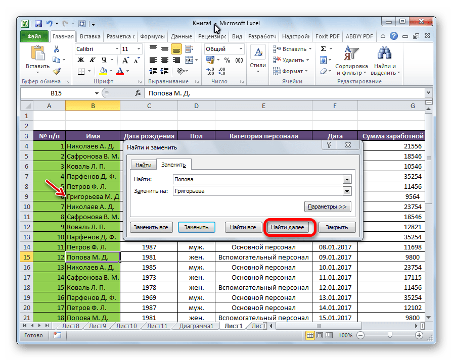 Совет: Когда вы нажимаете кнопку найти все, выводится каждое вхождение условия, которое вы ищете, и щелчок по определенному вхождению в списке выберет ячейку. Чтобы отсортировать результаты поиска » найти все «, щелкните заголовок столбца.