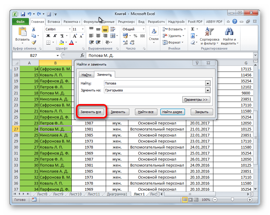 Можно выполнить автоматическую подмену нажатием всего одной клавиши. Для этого опосля ввода заменяемых значений, и значений, на которые делается подмена, нажимаем клавишу «Заменить все».