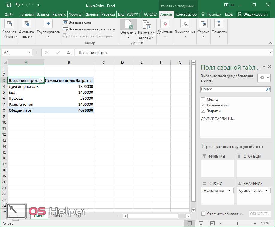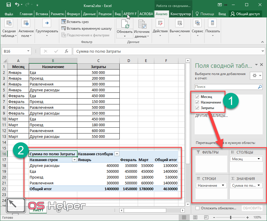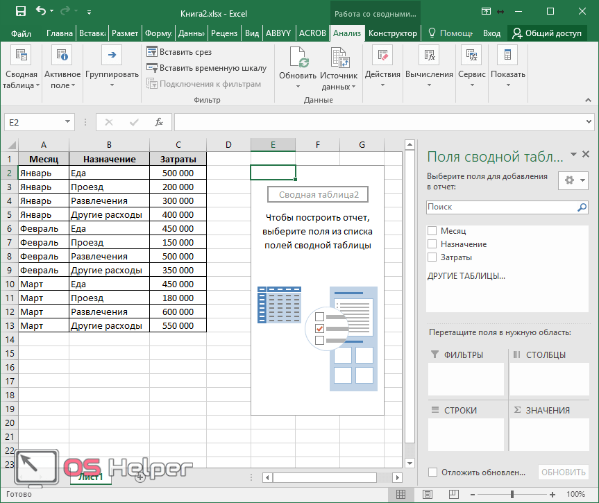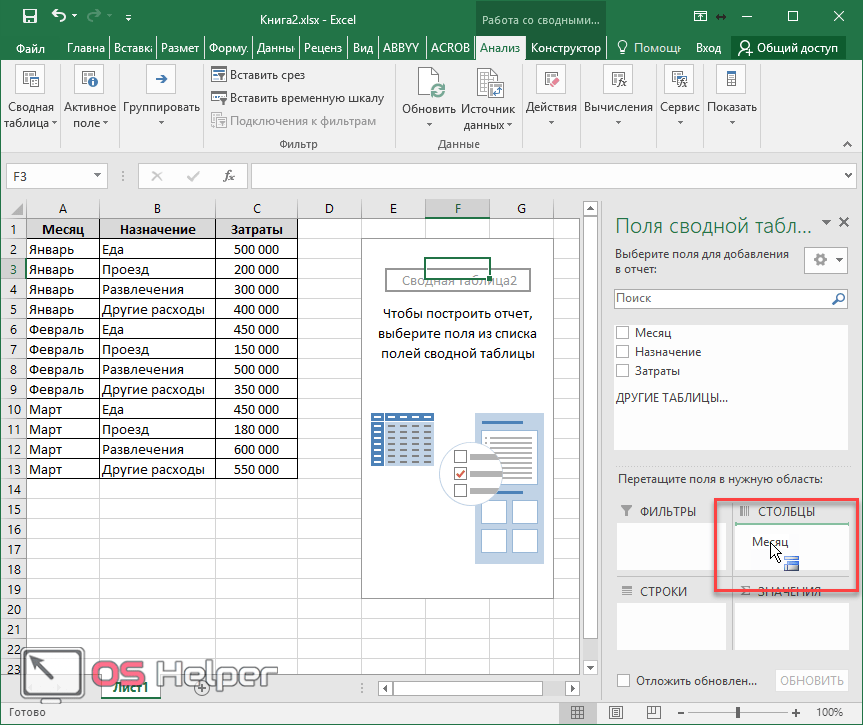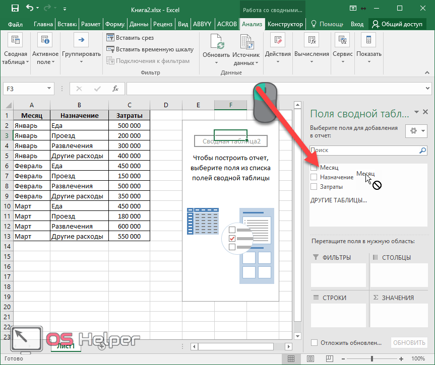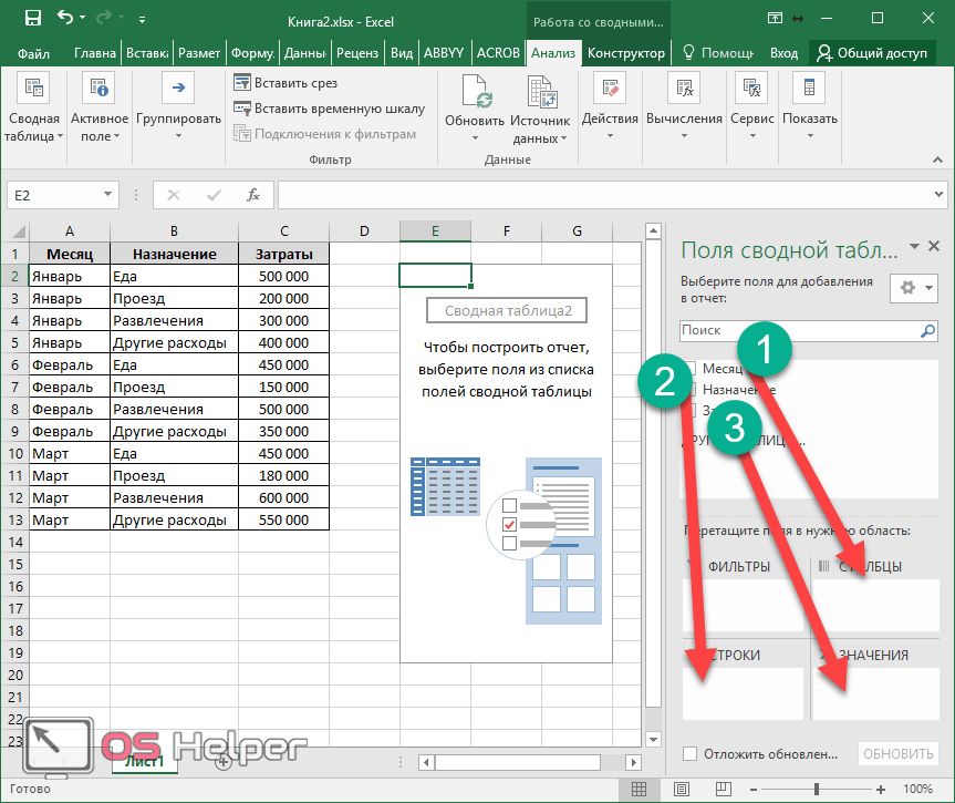 - На этом этапе необходимо перенести поля в нужные категории. Столбцами у нас будут месяцы, строками – назначение затрат, а значениями – сумма денег.