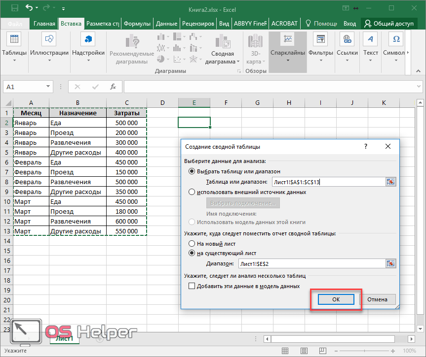Когда стиль будет выбран откроется окошко, где нужно будет задать диапазон ячеек, к которому он будет применён. Так как ранее вы выделили область, к которой данный стиль будет применён, вам ничего менять в этом окне не нужно, поэтому просто нажмите на «Ок».