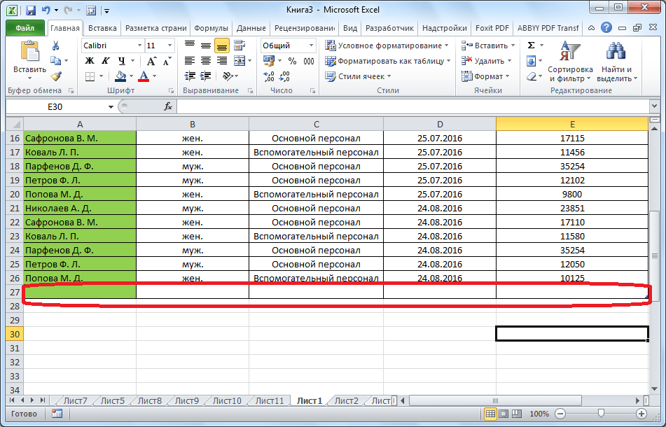 - Жмите на 1-ую пустую строчку под последней строкой с данными.
