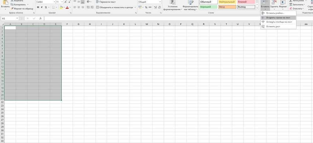 Для этого надо выделить горизонтальный ряд, над которым следует создать новый, зайти в меню «Вставка», перейти на пункт «Строки», кликнуть по нему. В результате появляется такое количество новых строк, какое было выделено перед посещением меню «Вставка».